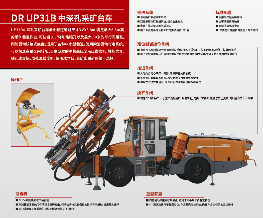 UP31B中深孔采矿台车,适用于中小型巷道的采矿作业。台车配备ZY104MZ凿岩机,钻凿φ64-102mm,孔深50m的中深孔,先进的电比例负载敏感操作系统的应用,将给你带来高精准的钻孔体验。